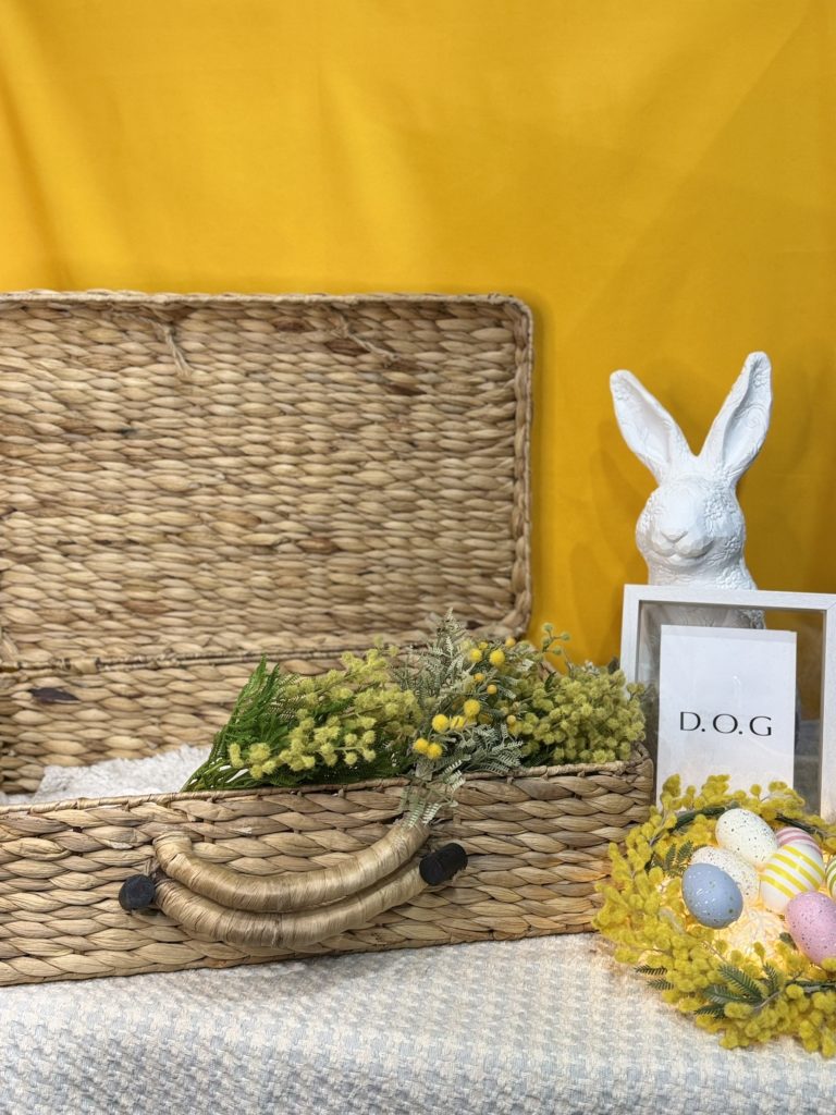 ナチュラルなバスケットにミモザをあしらい、明るくやさしい雰囲気に仕上げました。